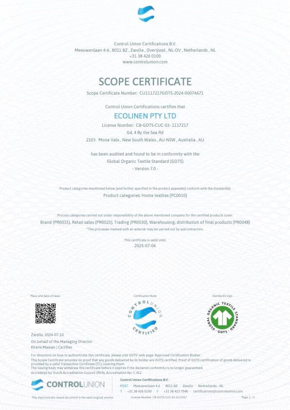 | Material | Pure 100% GOTS certified organic cotton fibre |