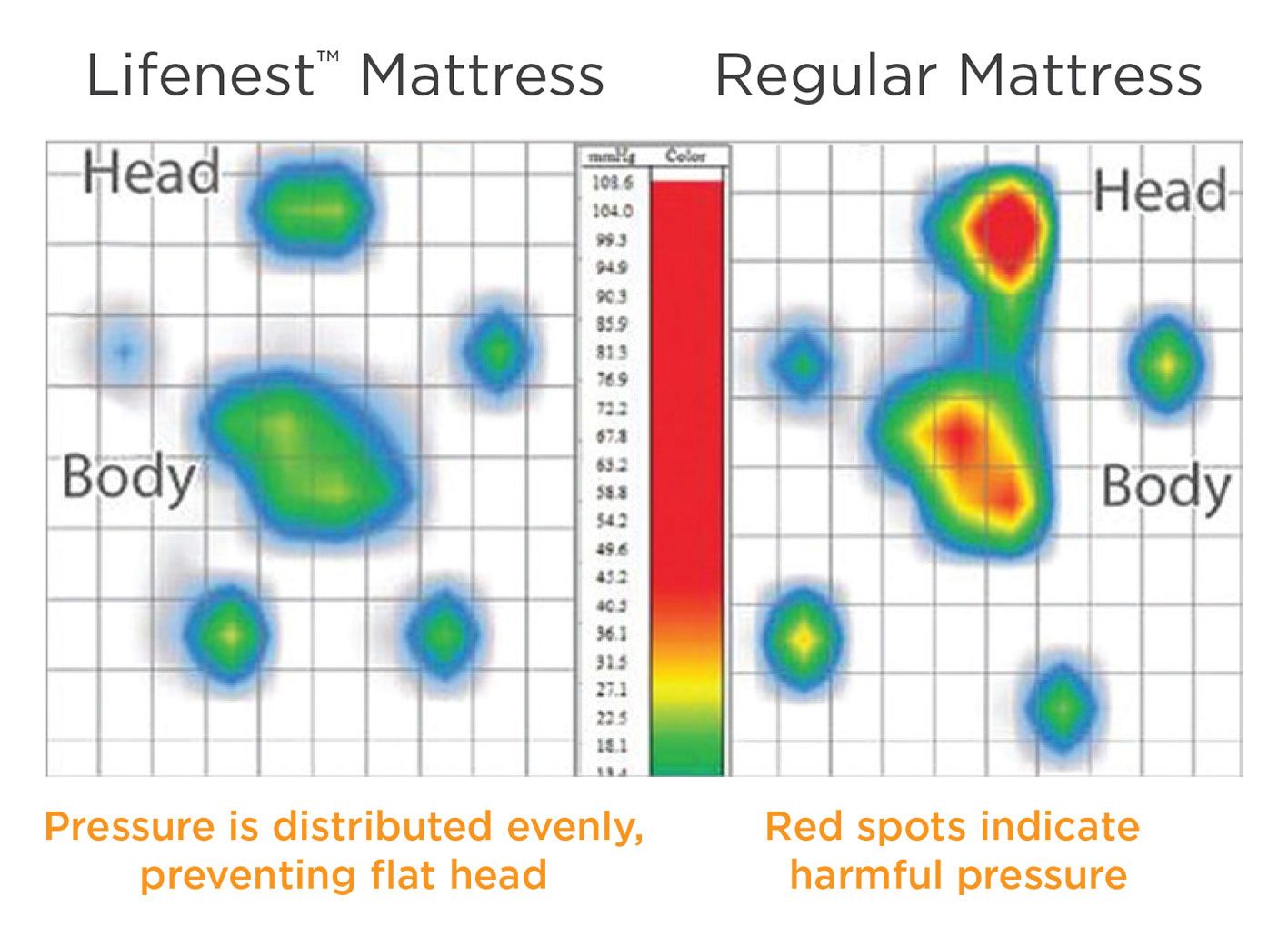 Unlike traditional mattresses, the unique woven cradle contours to the shape of the babies head. This allows a more even distribution of pressure, redistributing it away from soft spots, helping to avoid the pressure build-up that can