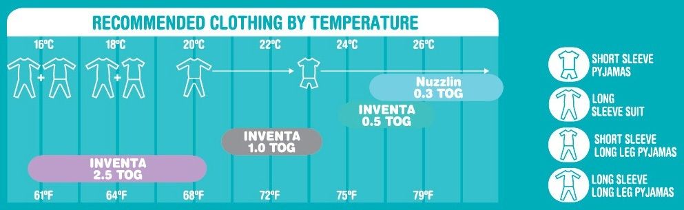 Clothing table is to be used as a guide only. All babies are different. The number of clothing layers may vary according to a child's health, their physiology and the temperature in the room. The carer must determine what is suitable.