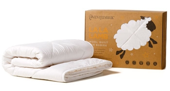 The MiniJumbuk La La Lamb Australian Wool Quilt for Babies has a mid-weight 325gsm wool fill and fine cotton casing - to gently balance your child's temperature and deliver the most comfortable sleep throughout the night.