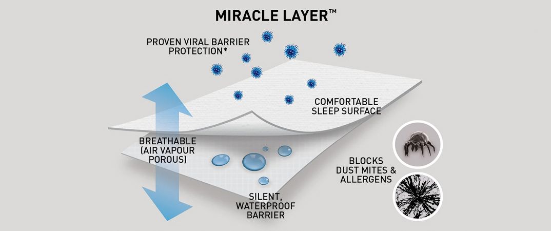 <li>Waterproof yet breathable Miracle Membrane® barrier protects mattress from dust mites and keeps it stain free</li>