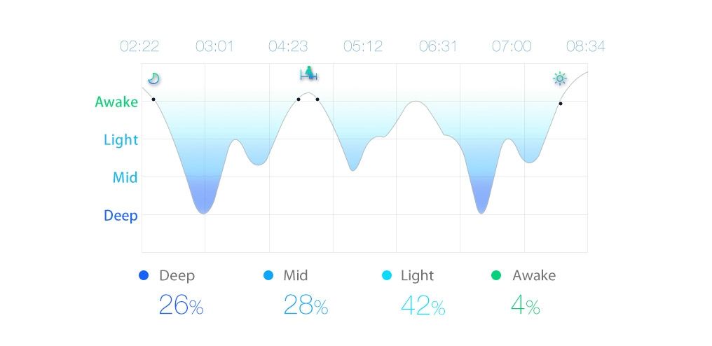 Besides monitoring real-time heart rate and respiratory rate, RestOn can also keep a comprehensive score of your sleep. Sleep time and duration, number of times waking up and/or turning over and leaving the bed as well as breathing and heart rate are analyzed to determine the actual sleep quality.